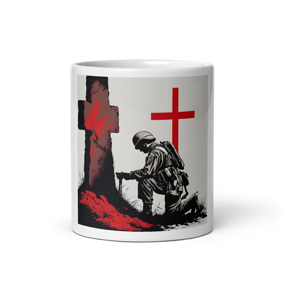 Show your love of Jesus with this beautiful design of a soldier kneeling before the cross.
